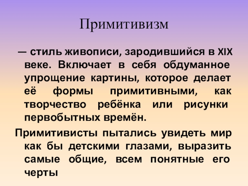 Примитивисты пытались увидеть мир как бы детскими глазами, выразить самые общие, всем понятные его черты