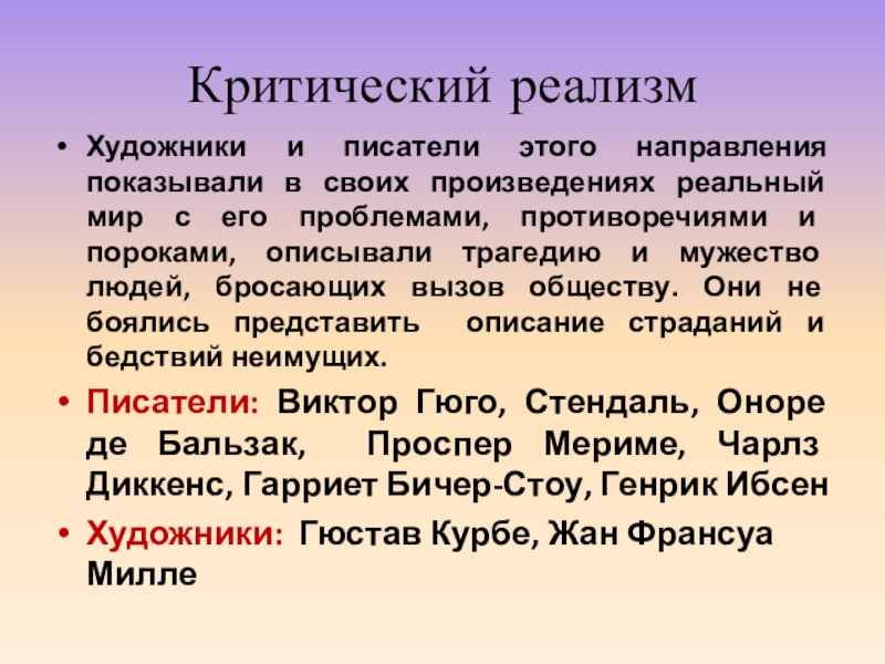 Художники и писатели этого направления показывали в своих произведениях реальный