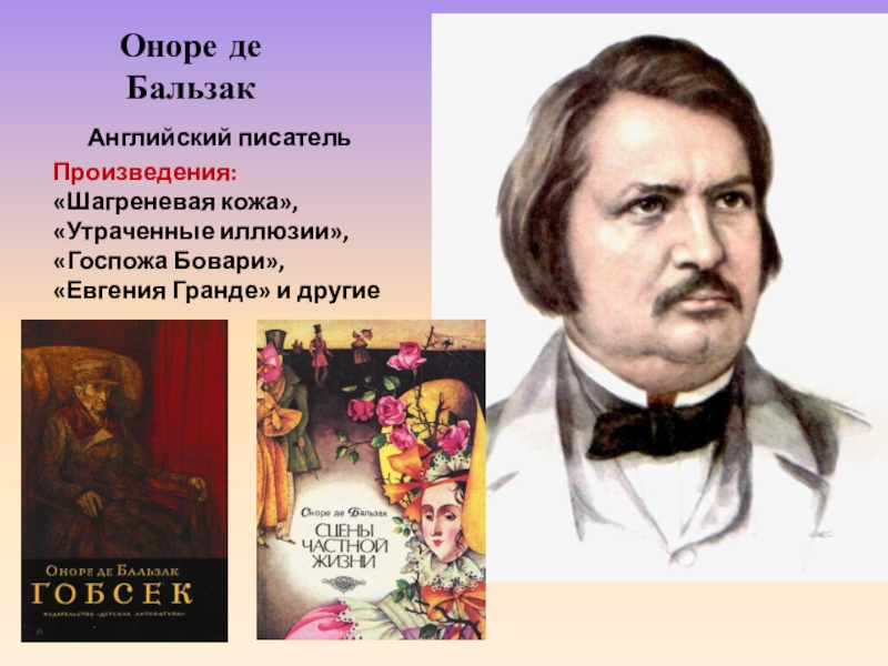 Произведения: «Шагреневая кожа», «Утраченные иллюзии», «Госпожа Бовари», «Евгения