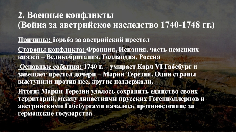 Основные события: 1740 г. – умирает Карл VI Габсбург и завещает престол дочери – Марии Терезии. Одни страны выступили против нее, другие поддержали.