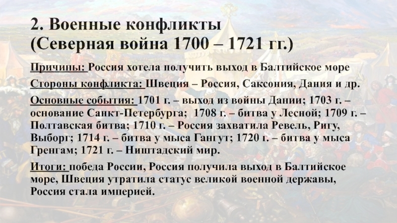 Основные события: 1701 г. – выход из войны Дании; 1703 г. – основание Санкт-Петербурга; 1708 г. – битва у Лесной; 1709 г. – Полтавская битва; 1710 г. – Россия захватила Ревель, Ригу, Выборг; 1714 г. – битва у мыса Гангут; 1720 г. – битва у мыса Гренгам; 1721 г. – Ништадский мир.