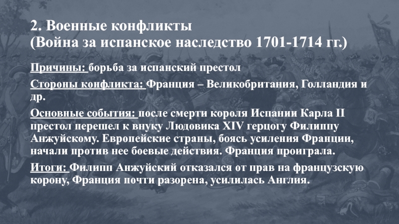 Основные события: после смерти короля Испании Карла II престол перешел к внуку Людовика XIV герцогу Филиппу Анжуйскому. Европейские страны, боясь усиления Франции, начали против нее боевые действия. Франция проиграла.