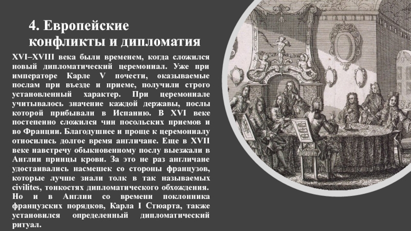 дипломатический церемониал. Уже при императоре Карле V почести, оказываемые послам при въезде и приеме, получили строго установленный характер. При церемониале учитывалось значение каждой державы, послы которой прибывали в Испанию. В XVI веке постепенно сложился чин посольских приемов и во Франции. Благодушнее и проще к церемониалу относились долгое время англичане. Еще в XVII веке навстречу обыкновенному послу выезжали в Англии принцы крови. За это не раз англичане удостаивались насмешек со стороны французов, которые лучше знали толк в так называемых civilites, тонкостях дипломатического обхождения. Но и в Англии со времени поклонника французских порядков, Карла I Стюарта, также установился определенный дипломатический ритуал.