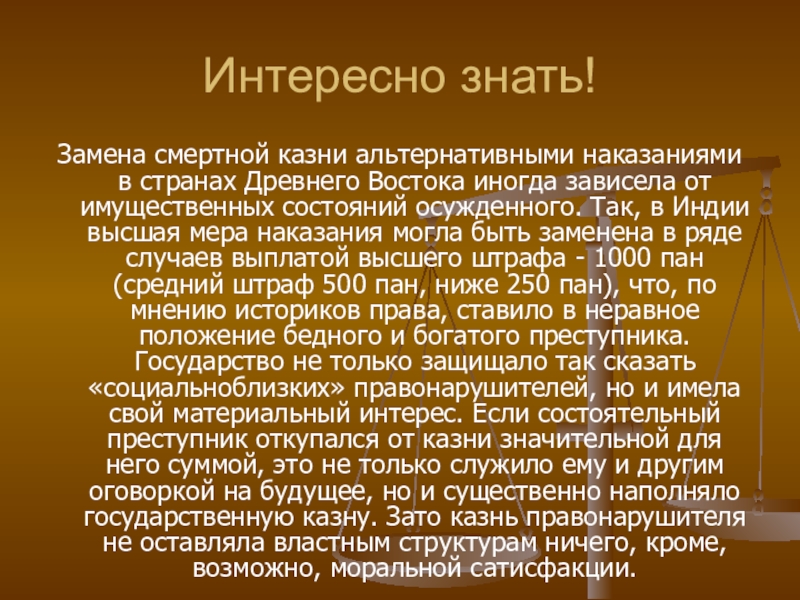 зависела от имущественных состояний осужденного. Так, в Индии высшая мера наказания могла быть заменена в ряде случаев выплатой высшего штрафа - 1000 пан(средний штраф 500 пан, ниже 250 пан), что, по мнению историков права, ставило в неравное положение бедного и богатого преступника. Государство не только защищало так сказать «социальноблизких» правонарушителей, но и имела свой материальный интерес. Если состоятельный преступник откупался от казни значительной для него суммой, это не только служило ему и другим оговоркой на будущее, но и существенно наполняло государственную казну. Зато казнь правонарушителя не оставляла властным структурам ничего, кроме, возможно, моральной сатисфакции.