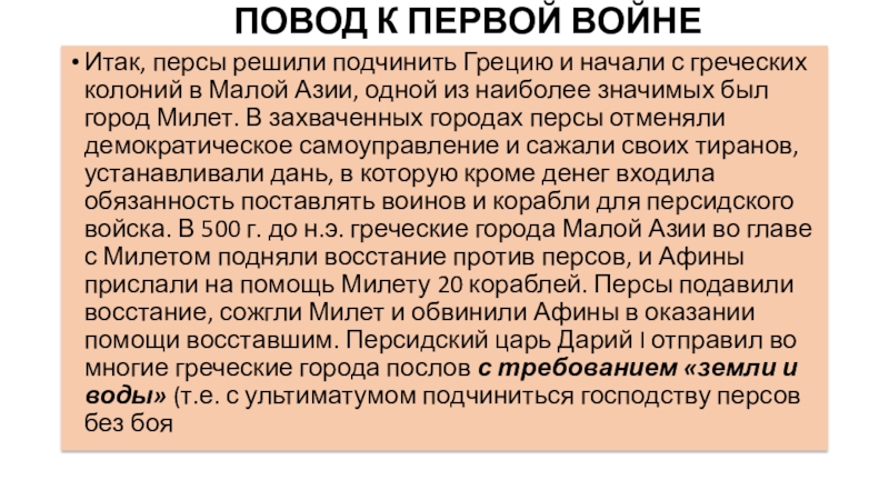 Итак, персы решили подчинить Грецию и начали с греческих колоний в Малой Азии, одной из наиболее значимых был город Милет. В захваченных городах персы отменяли демократическое самоуправление и сажали своих тиранов, устанавливали дань, в которую кроме денег входила обязанность поставлять воинов и корабли для персидского войска. В 500 г. до н.э. греческие города Малой Азии во главе с Милетом подняли восстание против персов, и Афины прислали на помощь Милету 20 кораблей. Персы подавили восстание, сожгли Милет и обвинили Афины в оказании помощи восставшим. Персидский царь Дарий I отправил во многие греческие города послов с требованием «земли и воды» (т.е. с ультиматумом подчиниться господству персов без боя