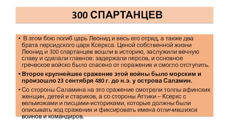 В этом бою погиб царь Леонид и весь его отряд, а также два брата персидского царя Ксеркса. Ценой собственной жизни Леонид и 300 спартанцев вошли в историю, заслужили вечную славу и сделали главное: задержали персов, и основное греческое войско было спасено от поражения и смогло отступить.