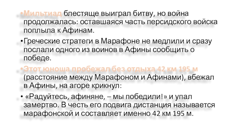 «Радуйтесь, афиняне, – мы победили!» и упал замертво. В честь его подвига дистанция называется марафонской и составляет именно 42 км 195 м.