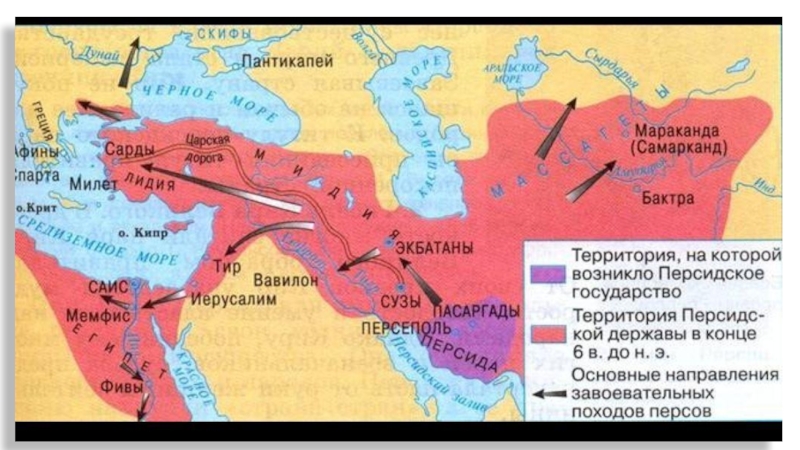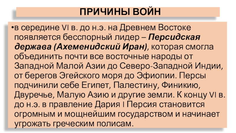 лидер – Персидская держава (Ахеменидский Иран), которая смогла объединить почти все восточные народы от Западной Малой Азии до Северо-Западной Индии, от берегов Эгейского моря до Эфиопии. Персы подчинили себе Египет, Палестину, Финикию, Двуречье, Малую Азию и другие земли. К концу VI в. до н.э. в правление Дария I Персия становится огромным и мощнейшим государством и начинает угрожать греческим полисам.