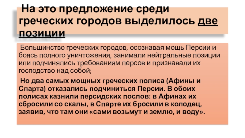 Слайд 8 На это предложение среди греческих городов выделилось две позиции