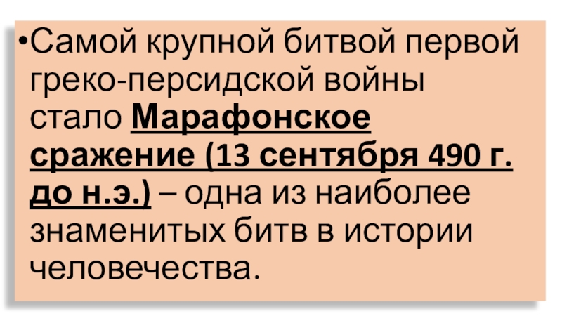 Слайд 11Самой крупной битвой первой греко-персидской войны стало Марафонское сражение (13 сентября 490 г. до