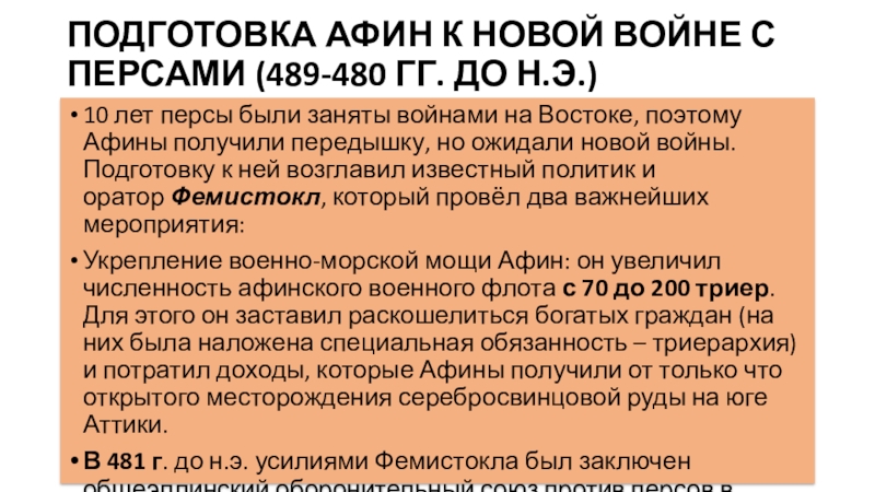 Слайд 15ПОДГОТОВКА АФИН К НОВОЙ ВОЙНЕ С ПЕРСАМИ (489-480 ГГ. ДО Н.Э.)