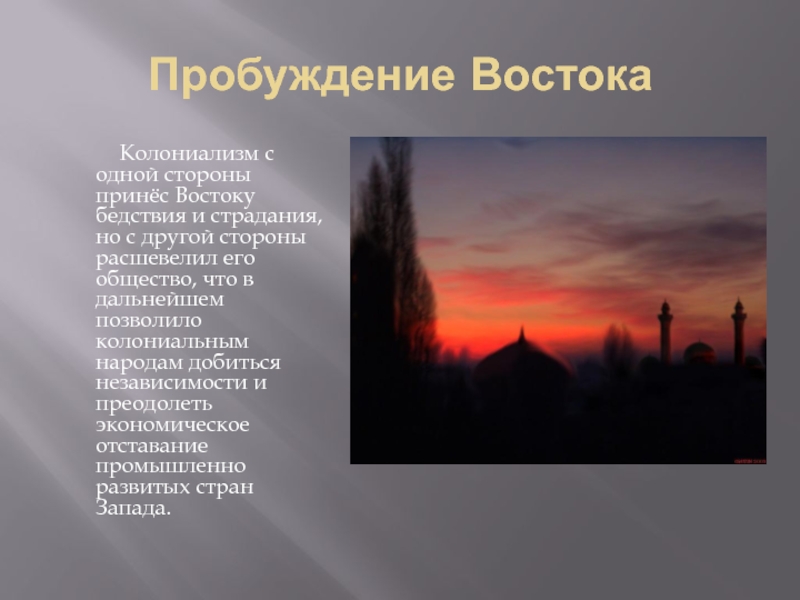 Пробуждение Востока      Колониализм с одной стороны принёс Востоку бедствия и страдания, но