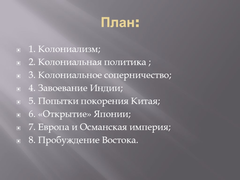План:1. Колониализм; 2. Колониальная политика ;3. Колониальное соперничество;4. Завоевание Индии; 5. Попытки покорения Китая; 6. «Открытие» Японии; 7. Европа и Османская империя; 8. Пробуждение Востока.