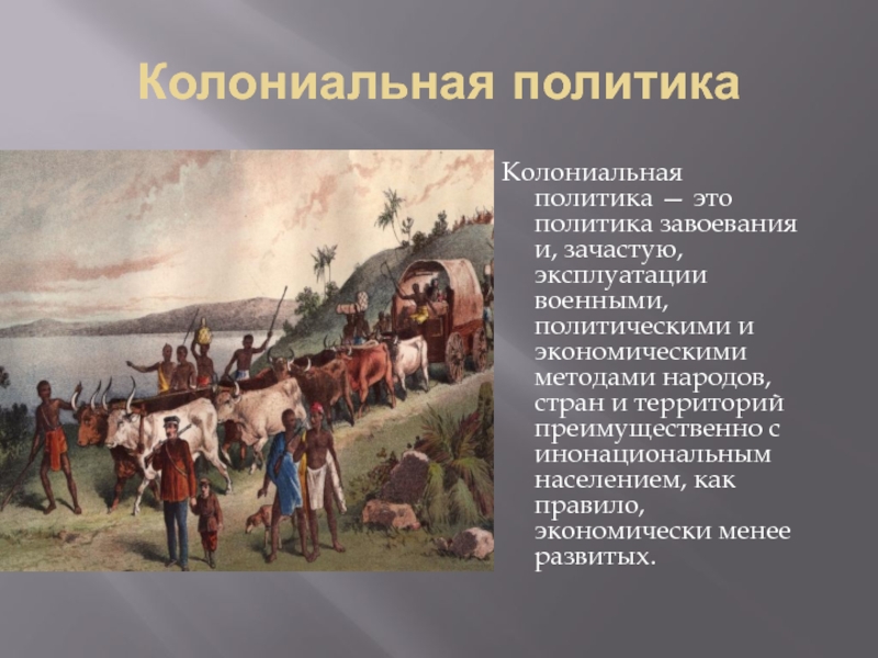 Колониальная политика Колониальная политика — это политика завоевания и, зачастую, эксплуатации военными, политическими и экономическими методами народов, стран