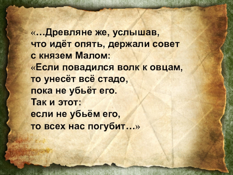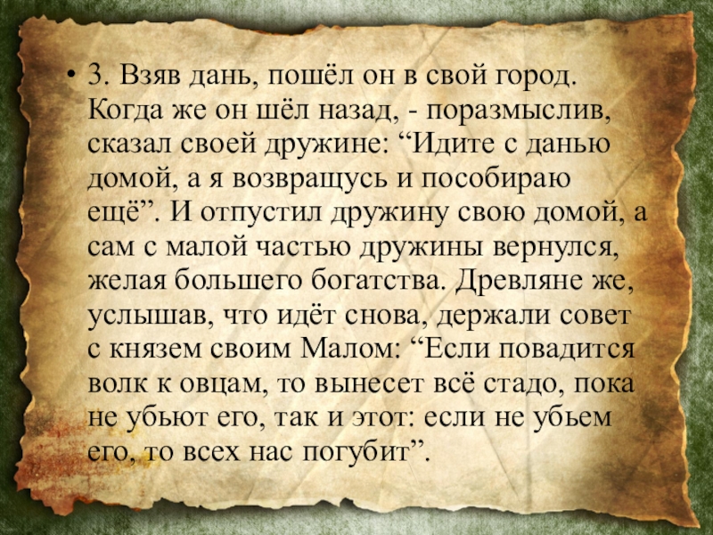 шёл назад, - поразмыслив, сказал своей дружине: “Идите с данью домой, а я возвращусь и пособираю ещё”. И отпустил дружину свою домой, а сам с малой частью дружины вернулся, желая большего богатства. Древляне же, услышав, что идёт снова, держали совет с князем своим Малом: “Если повадится волк к овцам, то вынесет всё стадо, пока не убьют его, так и этот: если не убьем его, то всех нас погубит”.