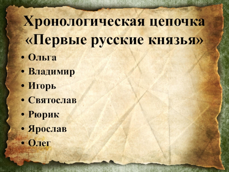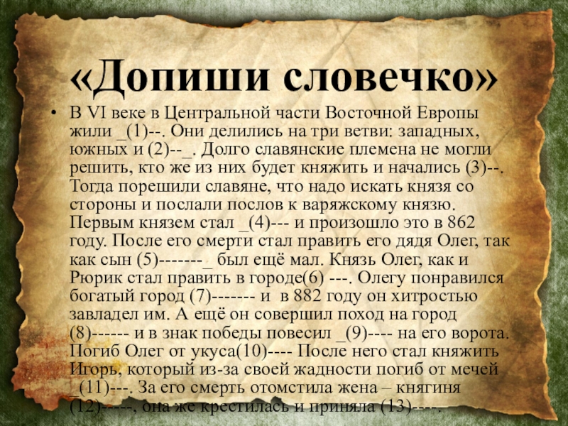 Они делились на три ветви: западных, южных и (2)--_. Долго славянские племена не могли решить, кто же из них будет княжить и начались (3)--. Тогда порешили славяне, что надо искать князя со стороны и послали послов к варяжскому князю. Первым князем стал _(4)--- и произошло это в 862 году. После его смерти стал править его дядя Олег, так как сын (5)-------_ был ещё мал. Князь Олег, как и Рюрик стал править в городе(6) ---. Олегу понравился богатый город (7)------- и в 882 году он хитростью завладел им. А ещё он совершил поход на город (8)------ и в знак победы повесил _(9)---- на его ворота. Погиб Олег от укуса(10)---- После него стал княжить Игорь, который из-за своей жадности погиб от мечей _(11)---. За его смерть отомстила жена – княгиня (12)-----, она же крестилась и приняла (13)----.