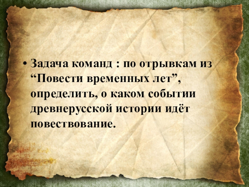 Слайд 25Задача команд : по отрывкам из “Повести временных лет”, определить, о