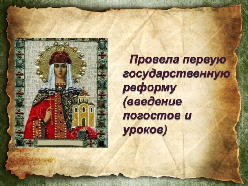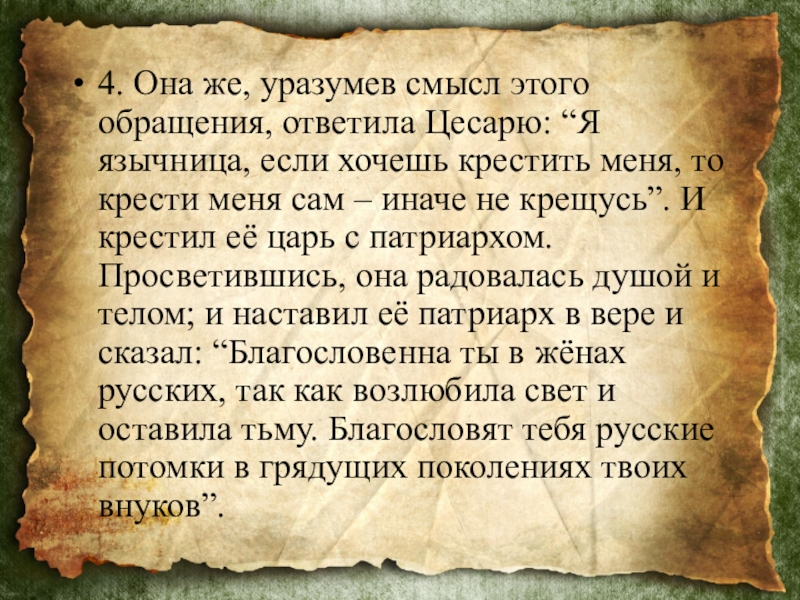 если хочешь крестить меня, то крести меня сам – иначе не крещусь”. И крестил её царь с патриархом. Просветившись, она радовалась душой и телом; и наставил её патриарх в вере и сказал: “Благословенна ты в жёнах русских, так как возлюбила свет и оставила тьму. Благословят тебя русские потомки в грядущих поколениях твоих внуков”.
