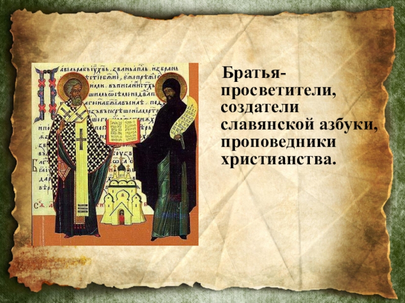 Слайд 15 Братья-просветители, создатели славянской азбуки, проповедники христианства.