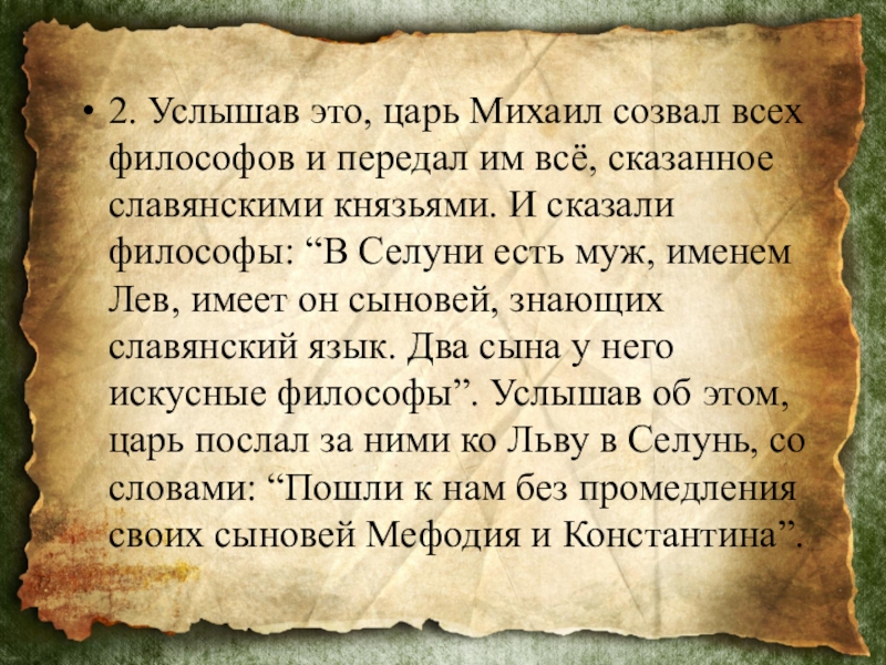Слайд 272. Услышав это, царь Михаил созвал всех философов и передал им