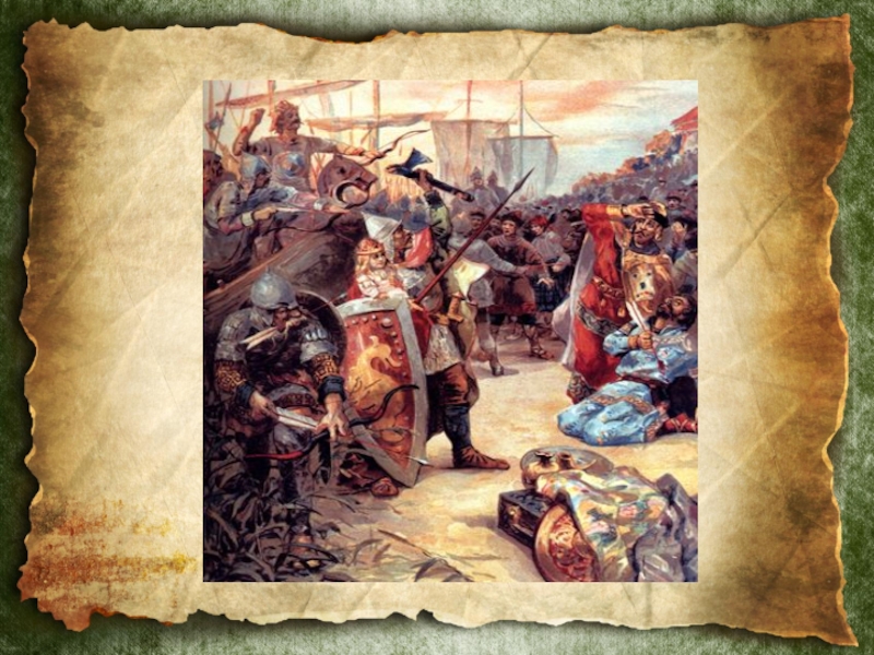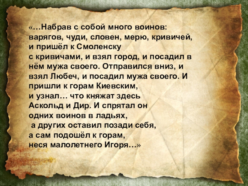 Слайд 38«…Набрав с собой много воинов: варягов, чуди, словен, мерю, кривичей, и