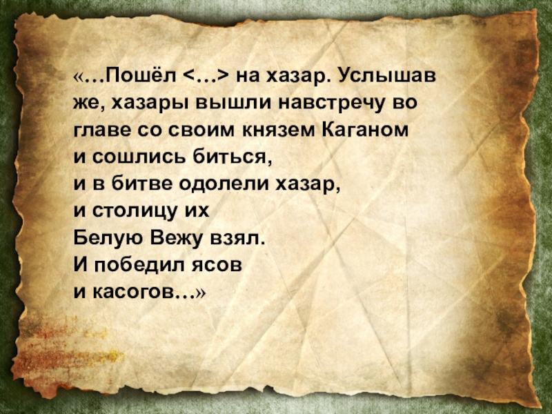 Слайд 37«…Пошёл на хазар. Услышав же, хазары вышли навстречу во главе