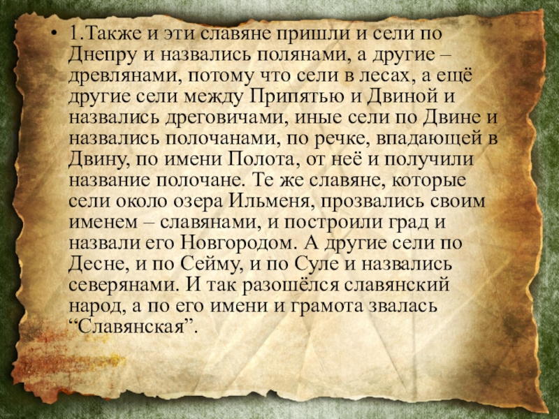 полянами, а другие – древлянами, потому что сели в лесах, а ещё другие сели между Припятью и Двиной и назвались дреговичами, иные сели по Двине и назвались полочанами, по речке, впадающей в Двину, по имени Полота, от неё и получили название полочане. Те же славяне, которые сели около озера Ильменя, прозвались своим именем – славянами, и построили град и назвали его Новгородом. А другие сели по Десне, и по Сейму, и по Суле и назвались северянами. И так разошёлся славянский народ, а по его имени и грамота звалась “Славянская”.
