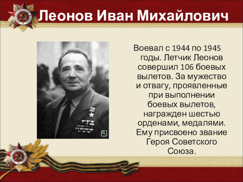 Воевал с 1944 по 1945 годы. Летчик Леонов совершил