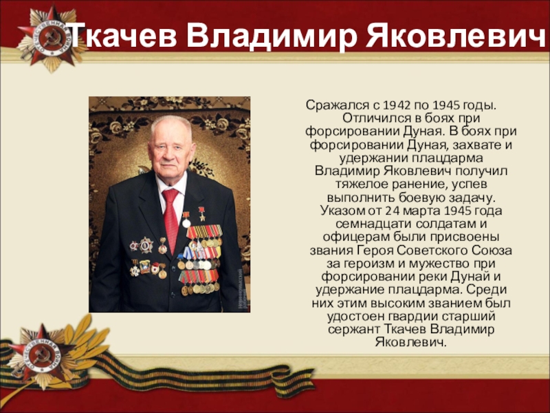 при форсировании Дуная. В боях при форсировании Дуная, захвате и удержании плацдарма Владимир Яковлевич получил тяжелое ранение, успев выполнить боевую задачу. Указом от 24 марта 1945 года семнадцати солдатам и офицерам были присвоены звания Героя Советского Союза за героизм и мужество при форсировании реки Дунай и удержание плацдарма. Среди них этим высоким званием был удостоен гвардии старший сержант Ткачев Владимир Яковлевич.