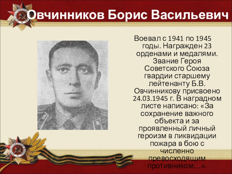 и медалями. Звание Героя Советского Союза гвардии старшему лейтенанту Б.В. Овчинникову присвоено 24.03.1945 г. В наградном листе написано: «За сохранение важного объекта и за проявленный личный героизм в ликвидации пожара в бою с численно превосходящим противником…».