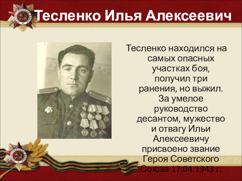 ранения, но выжил. За умелое руководство десантом, мужество и отвагу Ильи Алексеевичу присвоено звание Героя Советского Союза 17.04.1943 г.