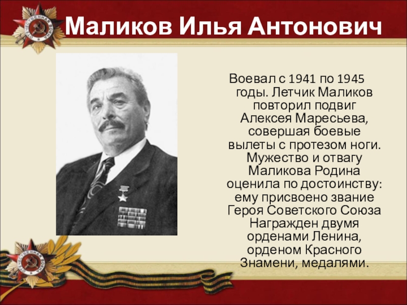 подвиг Алексея Маресьева, совершая боевые вылеты с протезом ноги. Мужество и отвагу Маликова Родина оценила по достоинству: ему присвоено звание Героя Советского Союза Награжден двумя орденами Ленина, орденом Красного Знамени, медалями.