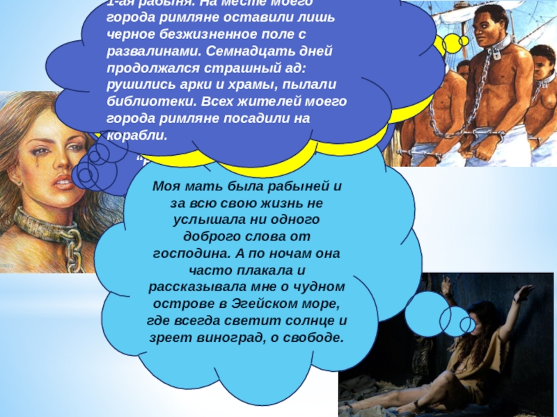 1-ая рабыня. На месте моего города римляне оставили лишь черное безжизненное поле с развалинами. Семнадцать дней продолжался страшный ад: рушились арки и храмы, пылали библиотеки. Всех жителей моего города римляне посадили на корабли.