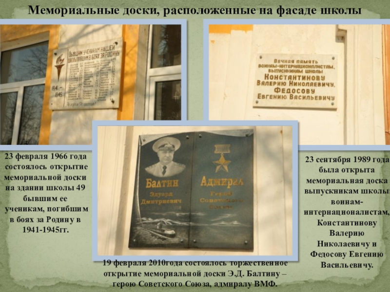 23 февраля 1966 года состоялось открытие мемориальной доски на здании школы 49 бывшим ее ученикам, погибшим в боях за Родину в 1941-1945гг.