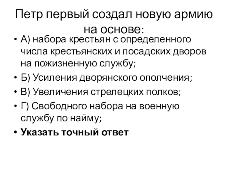 Слайд 5Петр первый создал новую армию на основе:
