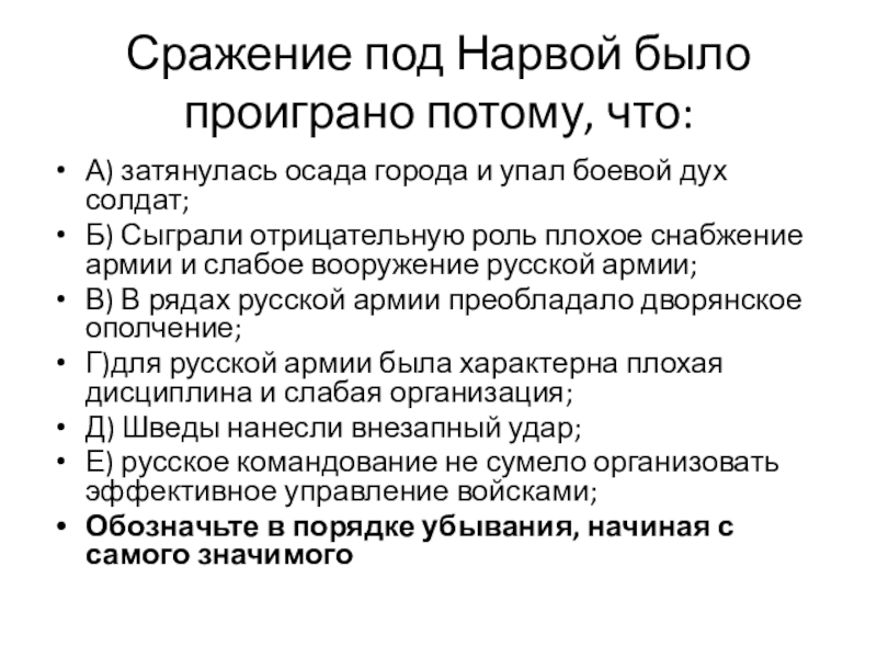 Слайд 4Сражение под Нарвой было проиграно потому, что: