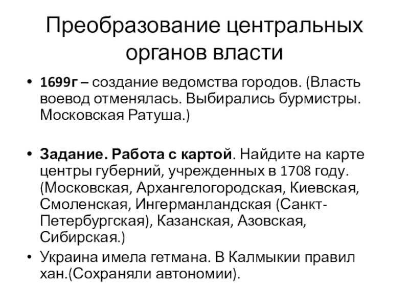 1699г – создание ведомства городов. (Власть воевод отменялась.