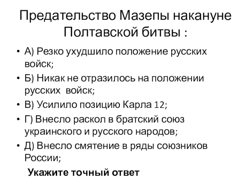 Слайд 6Предательство Мазепы накануне Полтавской битвы :