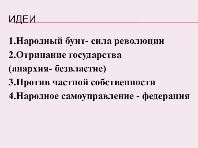 ИДЕИ1.Народный бунт- сила революции2.Отрицание государства (анархия- безвластие)3.Против частной собственности4.Народное самоуправление - федерация