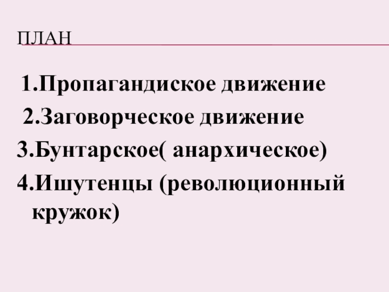 ПЛАН 1.Пропагандиское движение 2.Заговорческое движение3.Бунтарское( анархическое)4.Ишутенцы (революционный кружок)