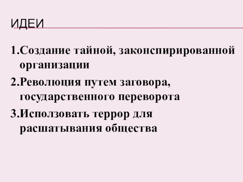 ИДЕИ1.Создание тайной, законспирированной организации2.Революция путем заговора, государственного переворота3.Исползовать террор для расшатывания общества