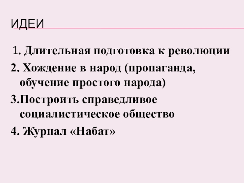 ИДЕИ 1. Длительная подготовка к революции2. Хождение в народ (пропаганда, обучение простого народа)3.Построить справедливое социалистическое общество4. Журнал