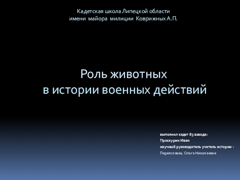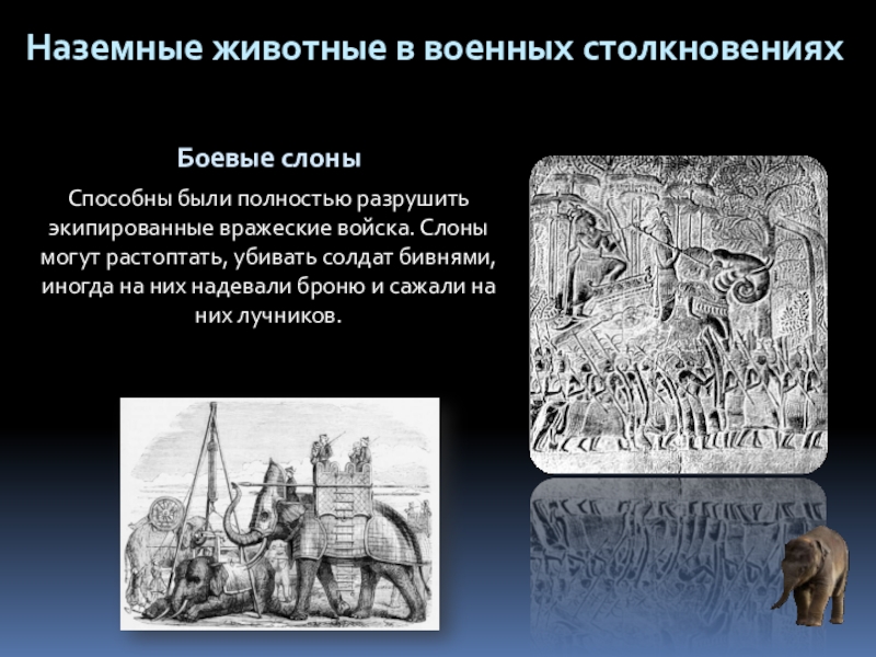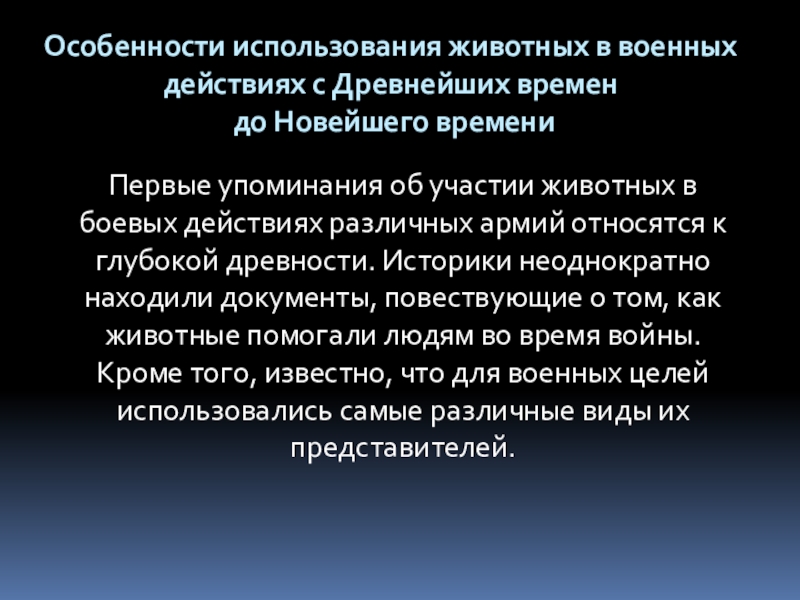 Первые упоминания об участии животных в боевых действиях различных армий относятся к глубокой древности. Историки неоднократно находили документы, повествующие о том, как животные помогали людям во время войны. Кроме того, известно, что для военных целей использовались самые различные виды их представителей.