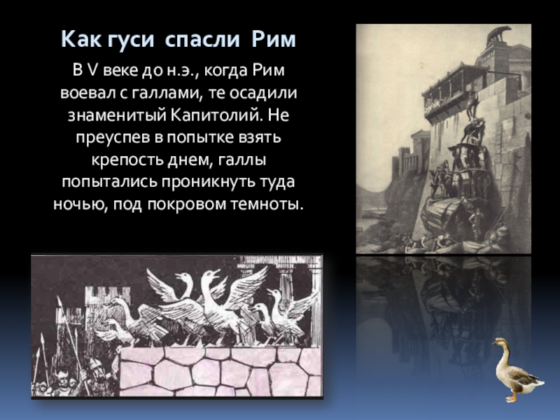 В V веке до н.э., когда Рим воевал с галлами, те осадили знаменитый Капитолий. Не преуспев в попытке взять крепость днем, галлы попытались проникнуть туда ночью, под покровом темноты.