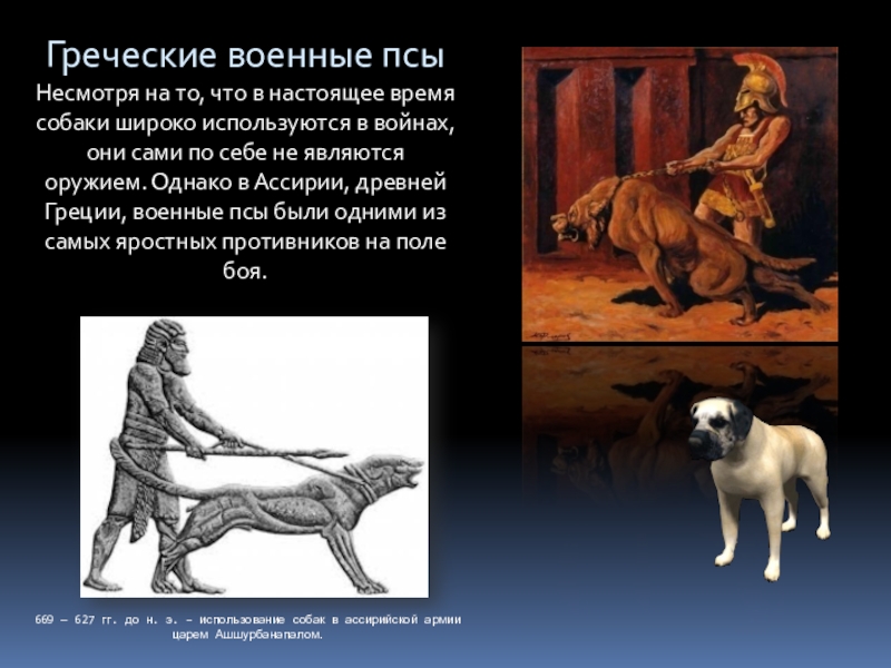669 — 627 гг. до н. э. – использование собак в ассирийской армии царем Ашшурбанапалом.