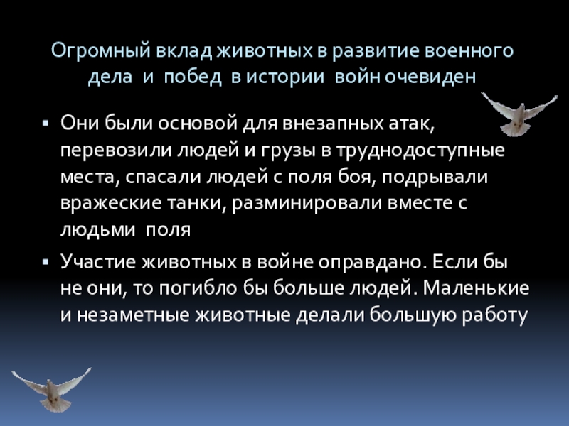 Участие животных в войне оправдано. Если бы не они, то погибло бы больше людей. Маленькие и незаметные животные делали большую работу