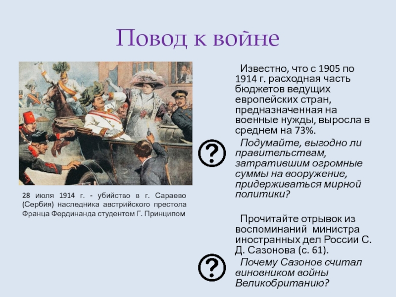 28 июля 1914 г. - убийство в г. Сараево (Сербия) наследника австрийского престола Франца Фердинанда студентом Г. Принципом