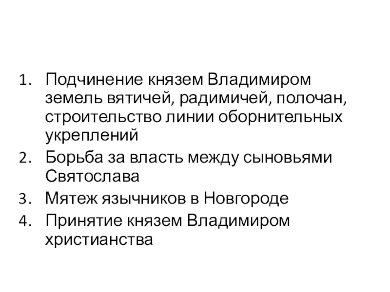 Подчинение князем Владимиром земель вятичей, радимичей, полочан, строительство линии оборнительных укрепленийБорьба за власть между сыновьями СвятославаМятеж язычников