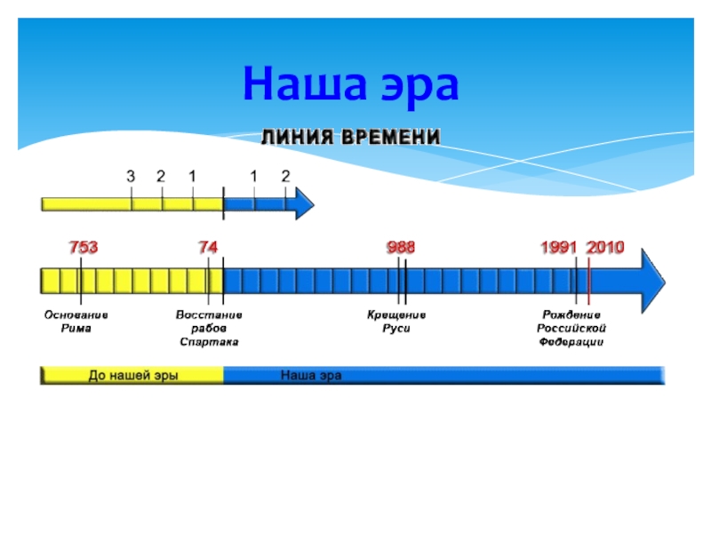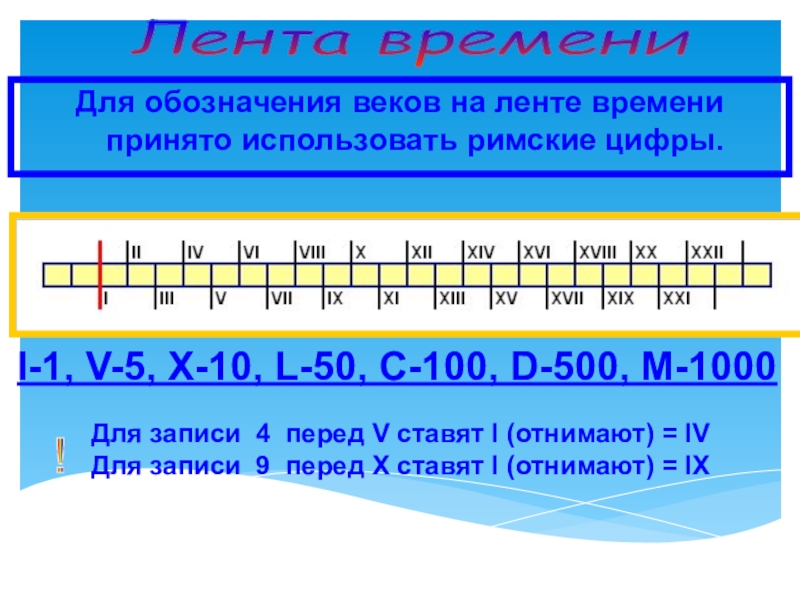 Лента времени Для обозначения веков на ленте времени принято использовать римские цифры.I-1, V-5, X-10, L-50, C-100, D-500,