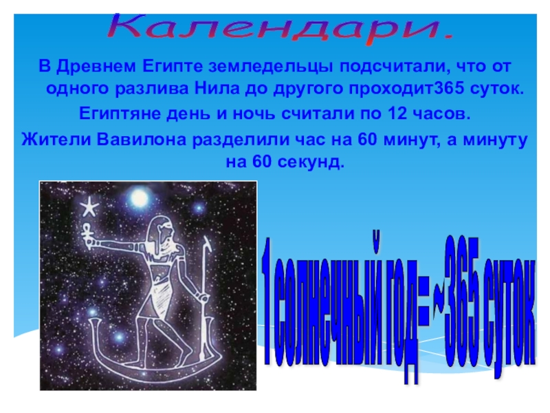 Календари. В Древнем Египте земледельцы подсчитали, что от одного разлива Нила до другого проходит365 суток.Египтяне день и